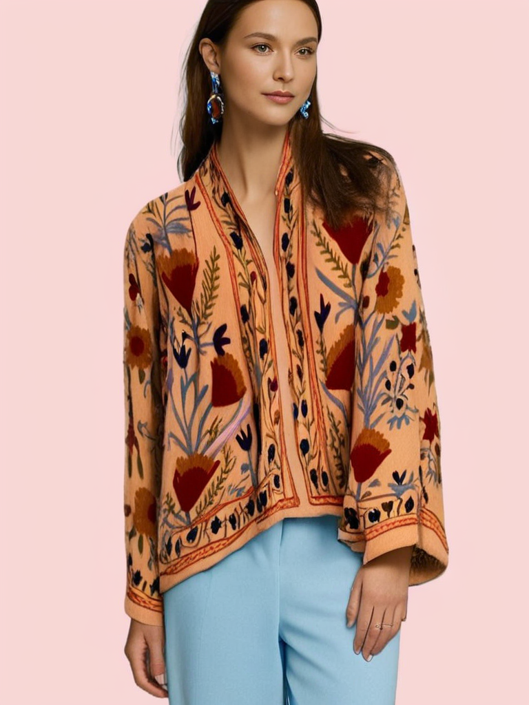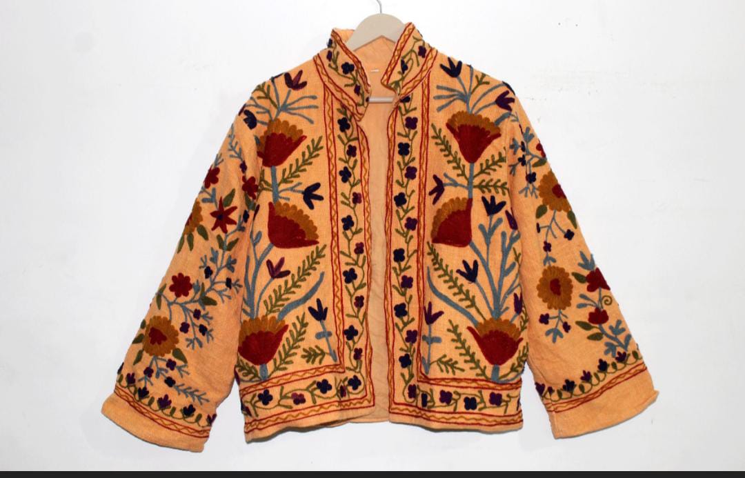 A Suzani ethnic jacket is a stunning and unique piece of clothing that showcases traditional craftsmanship and vibrant designs. Here’s a detailed description: