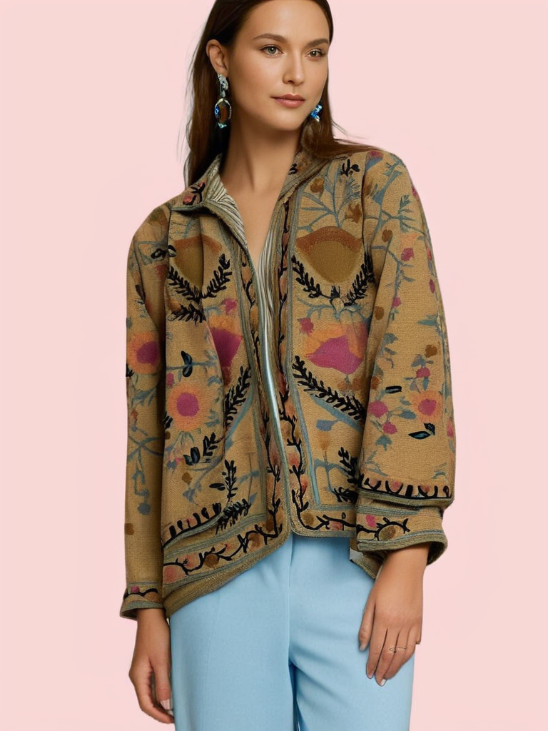 A Suzani ethnic jacket is a stunning and unique piece of clothing that showcases traditional craftsmanship and vibrant designs. Here’s a detailed description: